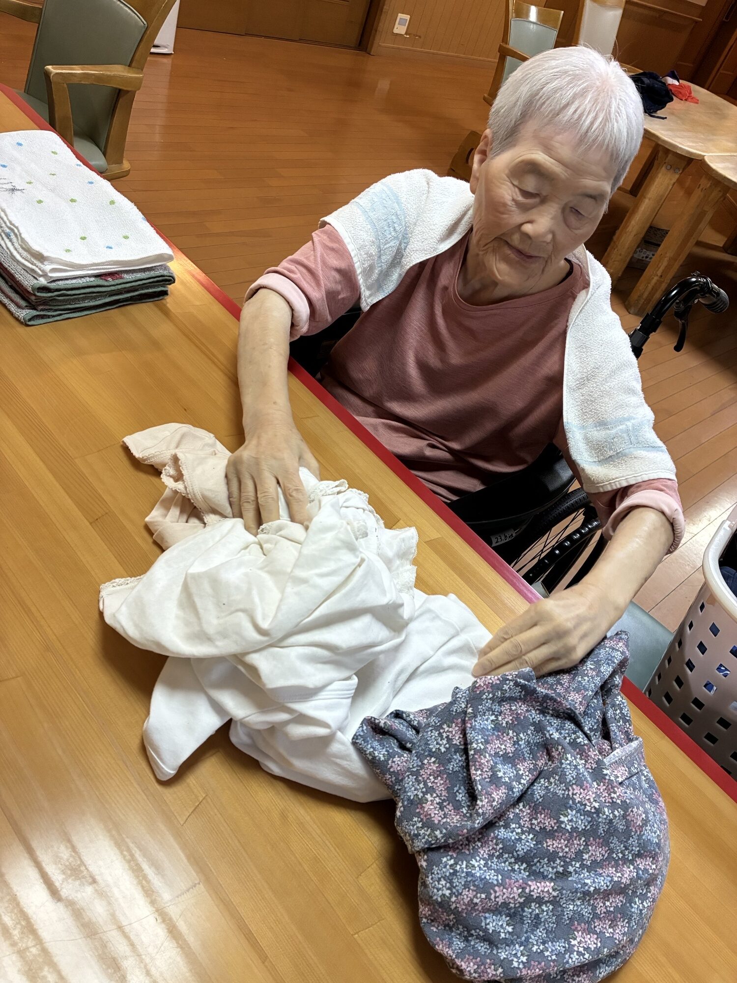 スタッフがしている洗濯たたみを一緒にしてくださる利用者様、手伝ってくださって助かっております!